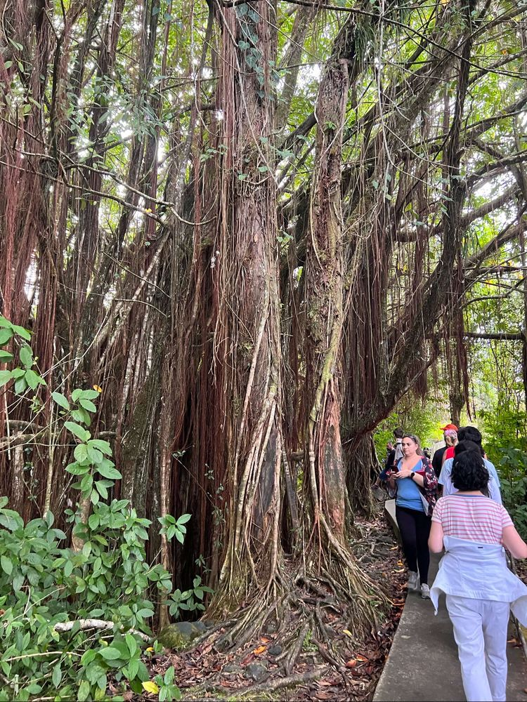 惊叹热带雨林树木的巨大,游客在参天大树下犹如小人国里的人物
