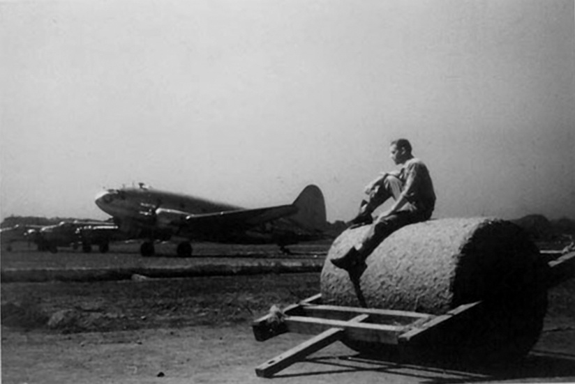 图为飞虎队队员在昆明拍照留念。从照片上看,一名美国飞虎队队员坐在巨大的压路墩上,看着远方,传达出肃穆之情。远处的飞机,给照片增添了战争的氛围。