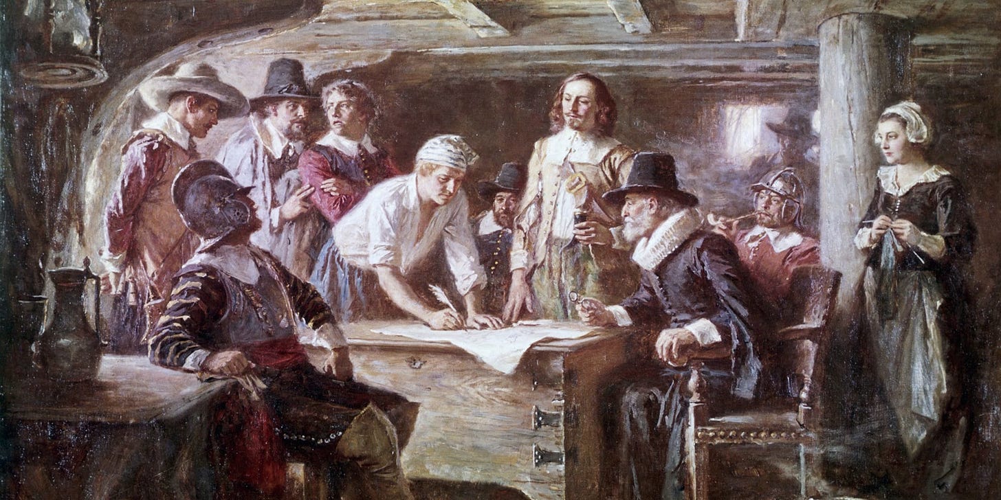 五月花公约精神及清教徒契约神学(人与上帝、人与社群的双重契约)成为新英格兰族群社会生活的情理法基础依据。区区一纸成文自治契约,既是人类现代进程的分水岭、照亮帝国世界的新曙光,也是美利坚国族文化的序章。自此,平等、人权、自由、民治成为美利坚新文明的原初基因,政权不再源自君主,而是源自契约与人民。