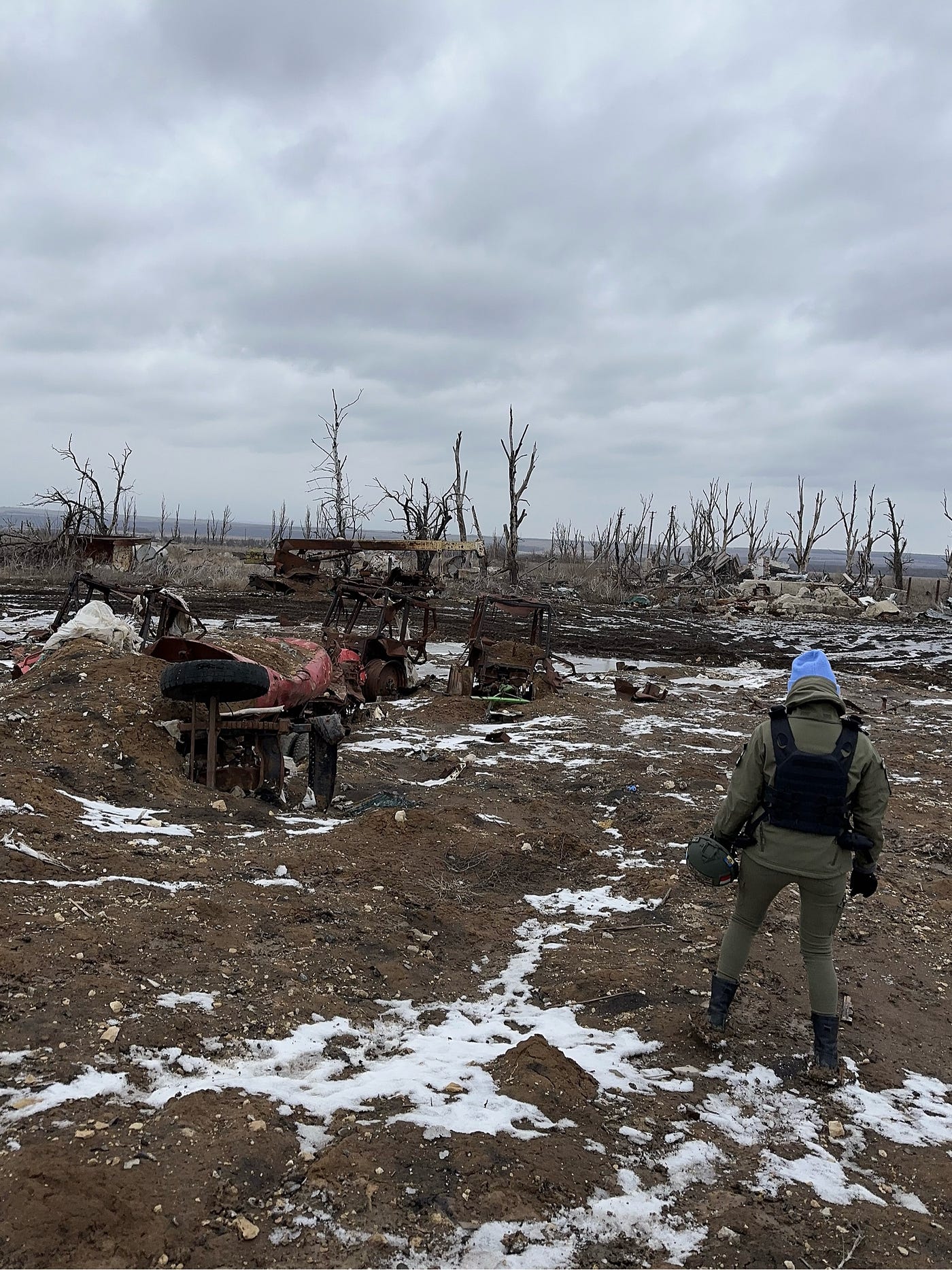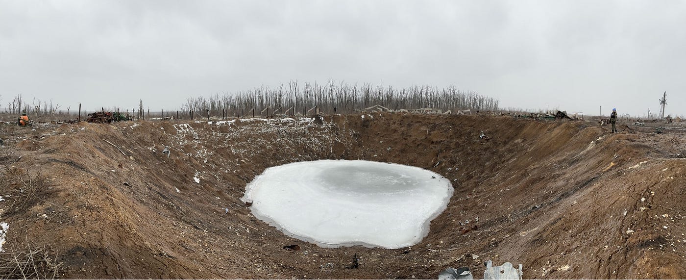 (图:乌克兰顿巴斯地区炸弹爆炸后的弹坑,背景有雪覆盖的荒地。Alla是图中右边的小黑点。图像的其余部分显示了小型KAB的效果。版权所有,Giorgio Provinciali)