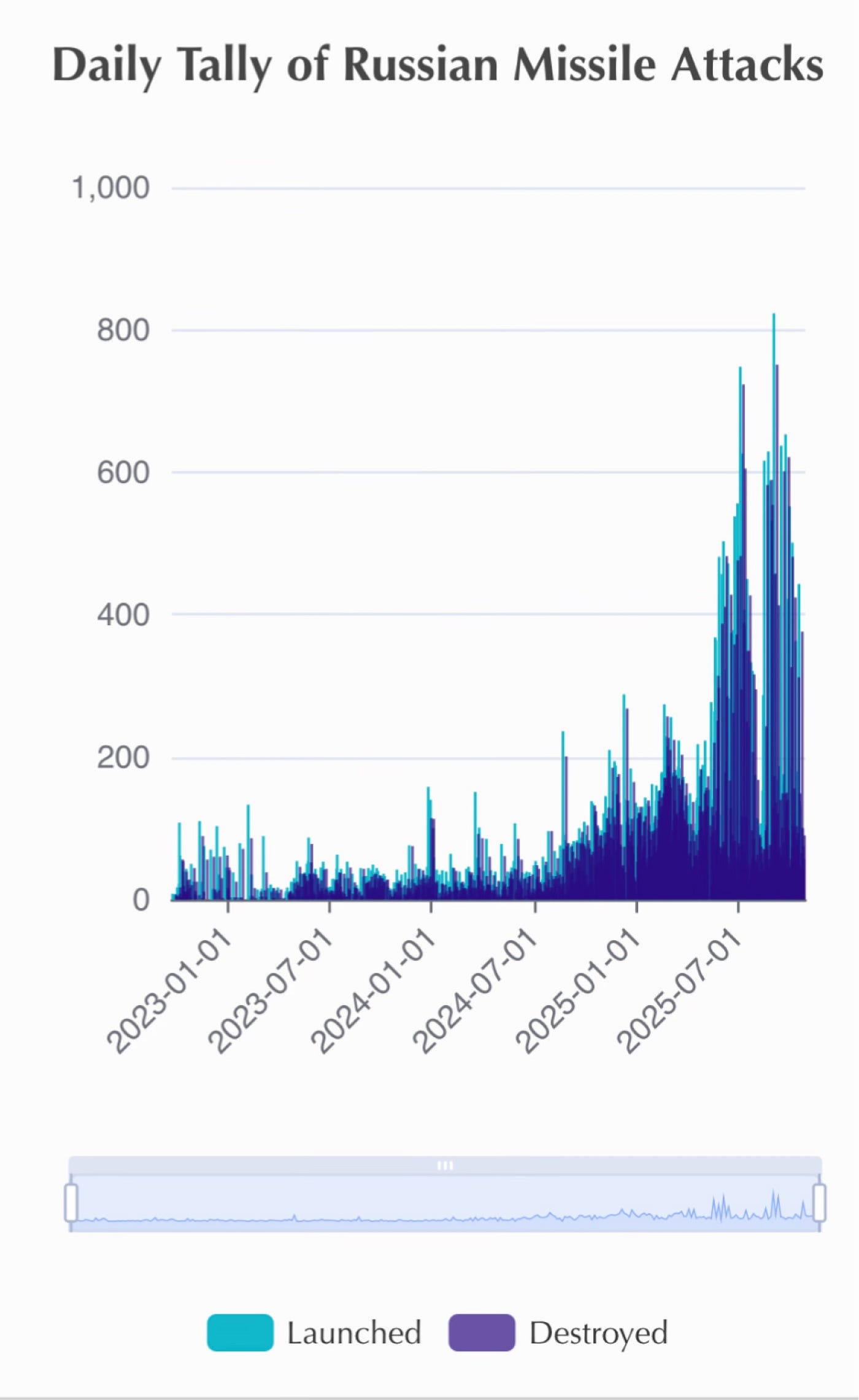 自2022年以来,俄军已投掷了33,000枚炸弹,每枚重250至3,000公斤不等。根据战略与国际研究中心(CSIS)的数据,仅在战争的头两年,俄军就发射了超过11,000枚弹道导弹和巡航导弹。另一方面,高爆无人机数量则稳定在每晚接近五百架。乌克兰在这方面的统计数据则明显低得多,弹道导弹甚至为零。