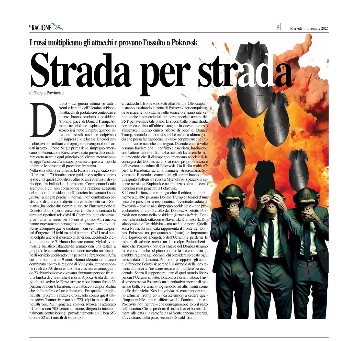 This is the context for Donald Trumps latest cynical peace effort, which consists in claiming thattheres no last straw that can break the camels backto show that Putin doesnt even want a truce. Saying thatsometimes you have to let the conflict play out, letting them fight among themselves,Trump has decided to wash his hands of the matter, believing that the American withdrawal will hasten the Ukrainian resistance in the Donbas and lead to the eventual fall of Pokrovsk. But from there to reality lies the Ukrainian Resistance.Immense, extraordinary. Superhuman.Fighting like titans, the Ukrainians repelled the Russian offensive at Myrnohrad, broke the enemy salient at Kupiansk, and neutralized over two hundred Russian raiders who had penetrated Pokrovsk.