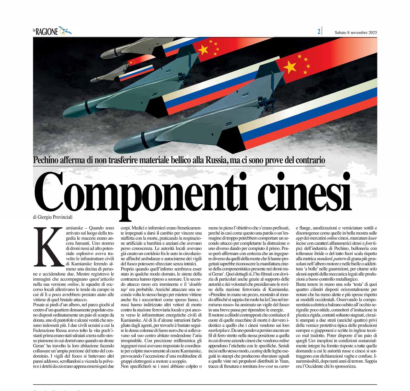 I wont specify whether the Russians fully hit their intended target because, in cases like this, one word or image could lead to a second attack to finish the job or a different one, considering the first one complete. However, I can say with certainty thatan engineer other than the death-dealers who designed them would be able to recognize the Chinese manufacturing of the components in the Russian Geran drones. I filmed those details thoroughly, thanks also to the support of the authorities and volunteers guarding the ruins of the Kamianske train station.
